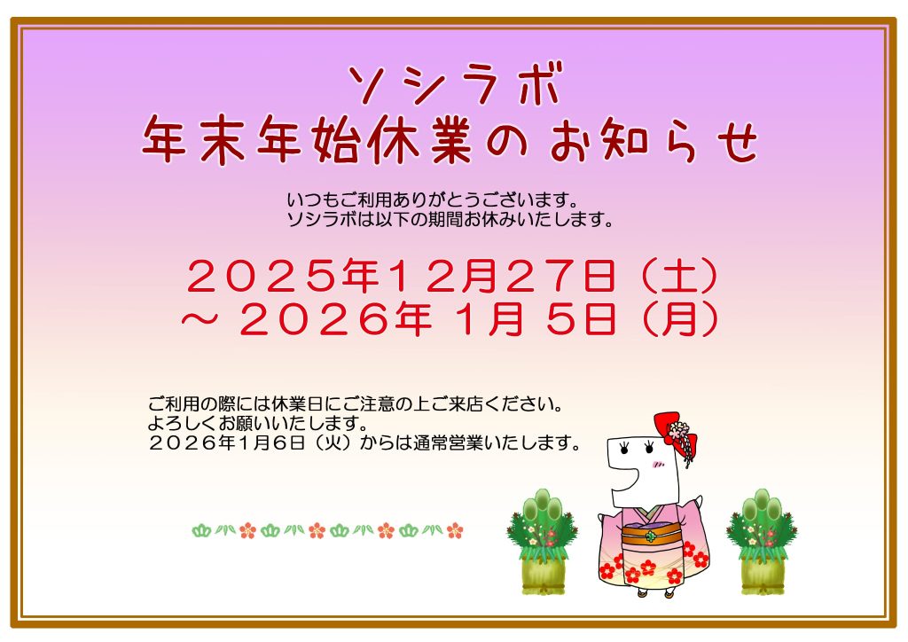 2025年12月2日 / 最終更新日 : 2025年12月2日 ソシラボ イベント 「年末年始休業のお知らせ」 「年末年始休業のお知らせ」 2025年12月27日(土)~2026年1月5日(月) いつもご利用ありがとうございます。 ソシラボは年末年始のお休みを頂きます。 ご利用の際には休業日にご注意の上ご来店ください。